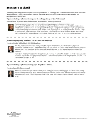 Wykształcenie zwiększa twoją zdolność służenia Panu. Daje ci moc błogosławienia bliźnich, szczególnie twojej rodziny. Im więcej się uczysz, tym bardziej możesz pomagać w budowaniu królestwa Bożego i wywierać dobry wpływ na świat. (Dla wzmocnienia młodzieży. Przewodnik do dokonywania wyborów [2022], str. 31–32)