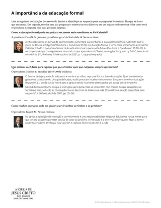 Podem também assistir a vídeos como “Educação para uma vida melhor” (4:55) ou “Love of Learning” (2:57) e observar como o aprendizado e a educação podem levar a bênçãos e oportunidades. Ambos os vídeos estão disponíveis no site ChurchofJesusChrist.org.