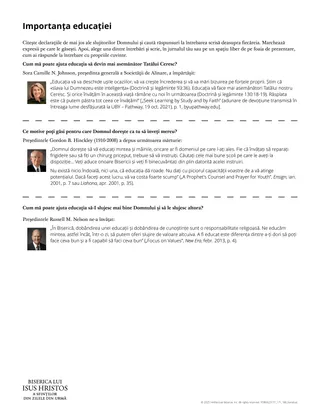 Educația vă sporește capacitatea de a-I sluji Domnului. Vă împuternicește să-i binecuvântați pe alții, în special pe membrii familiei voastre. Cu cât învățați mai mult, cu atât mai mult puteți să ajutați la clădirea împărăției lui Dumnezeu și să influențați lumea în bine” [Pentru întărirea tineretului – Îndrumar pentru a face alegeri (2022), p. 31-32].