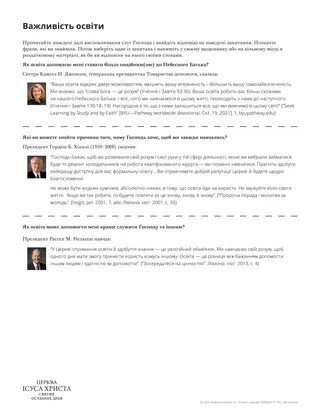 Завжди навчайтеся. Шукайте можливостей ставати розумнішими та вправнішими. Серед цих можливостей може бути здобуття формальної освіти у школі або професійне навчання, а також неформальне навчання з джерел, яким ви довіряєте. Залучайте Господа до своїх зусиль, і Він буде спрямовувати вас. Пізнаючи світ навколо вас, дізнавайтеся також про Спасителя, Який створив світ. Вивчайте Його життя та вчення. Нехай семінарія, інститут та особисте вивчення євангелії стануть складовою вашого навчання протягом усього життя…