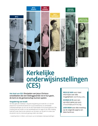 Laat de cursisten kennismaken met de mogelijkheden van de kerkelijke onderwijsinstellingen. Vertoon de video ‘The Growth and Momentum of the Church Educational System’ (5:25), waarin een aantal mogelijkheden kort worden uitgelegd. Deze video staat op Newsroom.ChurchofJesusChrist.org.