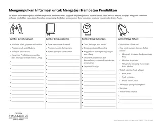 Siswa dapat menggunakan selebaran “Mengumpulkan Informasi untuk Mengatasi Hambatan Pendidikan” dan pelajaran yang mereka pelajari dari Yosua 3 untuk membantu mereka menjawab pertanyaan di bawah mengenai skenario yang mereka terima. Mereka dapat menuliskan jawaban mereka di bagian belakang kertas skenario.