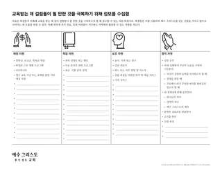 학생들은 “교육에 대한 장애물을 극복하기 위한 정보 수집” 유인물과 여호수아 3장에서 배운 교훈을 활용하여 자신이 받은 시나리오에 대해 아래 질문에 답할 수 있다. 학생들에게 시나리오 종이 뒷면에 자신의 답을 적으라고 한다.