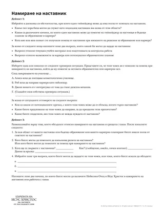 Когато размишлявате върху живота си, по какъв начин са ви помагали доверени наставници? Като се започне от Моисей и Исус Навин, и се стигне до Илий и Самуил, историите от Писанията илюстрират ценността на наставническите взаимоотношения. Тези истории ни насочват към нашите съвършени наставници – Небесния Отец и Исус Христос. Този урок може да помогне на учениците да изготвят план за откриване на потенциални наставници в областта на образованието и кариерата и свързване с тях.