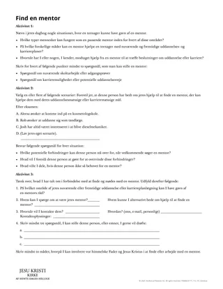 Når I tænker tilbage på jeres liv, hvordan har betroede mentorer så hjulpet jer? Beretninger fra skrifterne illustrerer værdien af at være mentor – fra Moses og Josva til Eli og Samuel. Disse beretninger henviser til vores fuldkomne mentorer, vor himmelske Fader og Jesus Kristus. Denne lektion kan hjælpe eleverne til at lægge en plan for at finde frem til og skabe forbindelse til mulige uddannelses- og karrierementorer.