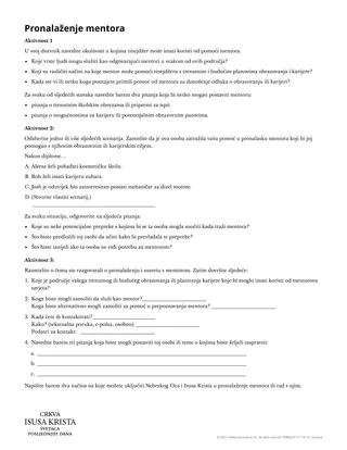 Kada razmišljate o svojem životu, kako su vam pouzdani mentori pomogli? Od Mojsija i Jošue do Elija i Samuela, priče iz Svetih pisama prikazuju vrijednost mentorskih odnosa. Te nas priče upućuju na naše savršene mentore, Nebeskog Oca i Isusa Krista. Ova lekcija može pomoći polaznicima napraviti plan za utvrđivanje potencijalnih mentora za obrazovanje i karijeru te povezivanje s njima.