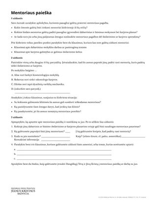Pastaba. Kai kurie mokiniai gali nesuprasti, kam jiems reikia mentoriaus. Galite paieškoti galimybių padėti jiems suprasti mentorių teikiamą naudą ir sritis, kuriose jie gali sulaukti pagalbos šiandien. Padėkite mokiniams suprasti, kad, kaip ir gidas, mentorius gali suteikti patirties ir įžvalgų, galinčių padėti mums orientuotis priimant su išsilavinimu ir karjera susijusius sprendimus.