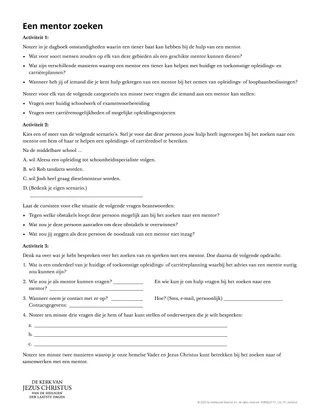 Als je terugkijkt op je leven, hoe hebben mentoren die je vertrouwt jou dan geholpen? Van Mozes en Jozua tot Eli en Samuel illustreren verhalen uit de Schriften de waarde van een mentor. Deze verhalen wijzen ons op onze volmaakte mentoren, onze hemelse Vader en Jezus Christus. In deze les stellen de cursisten een plan op om potentiële mentoren voor een opleiding of carrière te vinden en met hen in contact te komen.