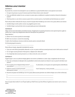 Când reflectezi asupra vieții tale, cum te-au ajutat mentorii de încredere? De la Moise și Iosua, la Eli și Samuel, istorisiri din scripturi ilustrează valoarea relațiilor de mentorat. Aceste istorisiri ne îndreaptă către mentorii noștri perfecți, Tatăl Ceresc și Isus Hristos. Această lecție poate ajuta cursanții să întocmească un plan pentru a identifica și a lua legătura cu potențiali mentori pentru educație și carieră.