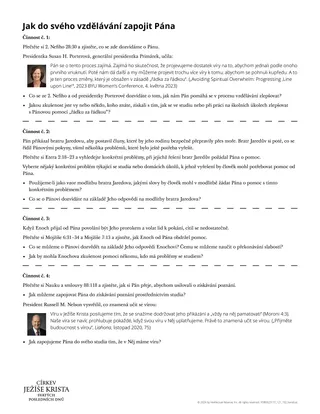Abyste studentům pomohli zamyslet se nad různými způsoby, jak můžeme zapojovat Pána do studia ve škole, mohli byste jim poskytnout příklady z písem. Můžete to udělat například pomocí handoutu „Zapojujme do svého vzdělávání Pána“. Studenty byste mohli rozdělit do skupinek a každé z nich přidělit část handoutu. Další možností je, že si studenti vyberou jednu část handoutu k prostudování a budou na ní pracovat s dalšími studenty, kteří si vybrali tentýž oddíl.