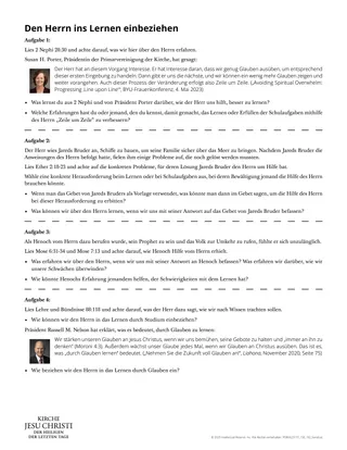 Um den Schülern zu helfen, darüber nachzudenken, wie wir den Herrn in unser Lernen in der Schule einbeziehen können, könnten Sie ihnen Beispiele aus den heiligen Schriften geben. Eine Möglichkeit dazu ist das Arbeitsblatt „Den Herrn ins Lernen einbeziehen“. Teilen Sie die Schüler in Kleingruppen ein und weisen Sie jeder Gruppe einen Abschnitt des Arbeitsblatts zu. Alternativ könnten die Schüler einen Teil des Arbeitsblatts auswählen und sich zusammen mit anderen Schülern, die denselben Abschnitt ausgewählt haben, damit befassen.