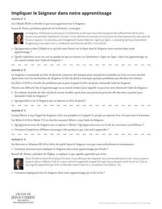 Au cours de notre scolarité, nous rencontrerons des obstacles dans nos efforts pour accroître notre connaissance et notre compréhension de la vérité. Cependant, nous n’avons pas besoin de faire face seuls à ces difficultés. Notre Père céleste et Jésus-Christ se soucient de nous et de nos progrès, et ils veulent nous soutenir dans nos efforts scolaires. Cette leçon aidera les apprenants à impliquer le Seigneur dans leur apprentissage.