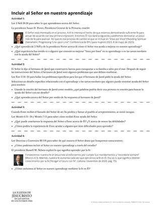 A fin de ayudar a los alumnos a pensar en diferentes maneras en que podemos hacer que el Señor forme parte de nuestro aprendizaje en la escuela, podría darles ejemplos de las Escrituras. Una manera de hacerlo es con el volante “Incluir al Señor en nuestro aprendizaje”. Podría organizar a los alumnos en grupos pequeños y asignar a cada grupo una parte del volante. Como alternativa, los alumnos podrían seleccionar una parte del volante para estudiarla y trabajar con otros alumnos que hayan seleccionado la misma parte.
