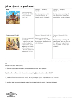 Abyste studentům pomohli objevit pravdy o tom, jak mohou být zodpovědní za své studium, mohli byste je vyzvat, aby vyplnili handout s názvem „Přijměme zodpovědnost“. Vyzvěte je, aby se zamysleli nad tím, jak by se příběhy z handoutu mohly vztahovat na ně. Mohli byste je rozdělit do skupinek a několik z nich vyzvat, aby si přečetli a zodpověděli otázky týkající se příběhu o Davidovi, zatímco ostatní budou studovat podobenství o hřivnách.
