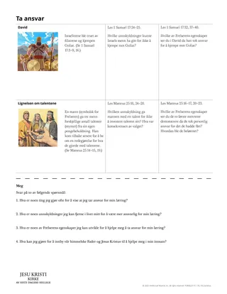 For å hjelpe elevene å oppdage sannheter om å være ansvarlig for egen læring, kan du be dem gjøre ferdig utdelingsarket “Ta ansvar”. Be elevene overveie hvordan historiene på utdelingsarket kan anvendes på dem. Du kan dele elevene inn i små grupper og be noen av elevene i hver gruppe lese og svare på spørsmålene i historien om David, mens de andre studerer lignelsen om talentene.