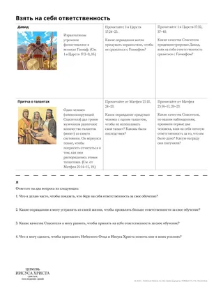 Чтобы помочь студентам выявить истины об ответственности за свое обучение, вы можете предложить им заполнить раздаточный материал «Взять на себя ответственность». Попросите студентов подумать о том, как истории, приведенные в раздаточном материале, можно применить к ним. Вы можете разделить студентов на небольшие группы и предложить некоторым из них прочитать и ответить на вопросы из истории о Давиде, в то время как другие изучат притчу о талантах.