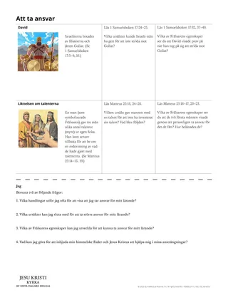 För att hjälpa eleverna upptäcka sanningar om att ta ansvar för sitt lärande kan du be dem fylla i utdelningsbladet ”Att ta ansvar”. Be eleverna fundera över hur berättelserna på utdelningsbladet kan tillämpas på dem. Du kan dela upp eleverna i små grupper och be några av eleverna i varje grupp att läsa och besvara frågorna till berättelsen om David medan de andra studerar liknelsen om talenterna.