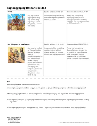 Para tulungan ang mga estudyante na matuklasan ang mga katotohanan tungkol sa pagiging responsable sa kanilang pag-aaral, maaari mo silang anyayahan na kumpletuhin ang handout na “Pagiging Responsable.” Anyayahan ang mga estudyante na pag-isipan kung paano maiaangkop sa kanila ang mga kuwento sa handout. Maaari mong ayusin ang mga estudyante sa maliliit na grupo at anyayahan ang ilan sa mga estudyante sa bawat grupo na basahin at sagutin ang mga tanong para sa kuwento ni David habang pinag-aaralan ng iba ang talinghaga ng mga talento.