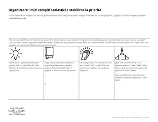 Per aiutare gli studenti a valutare i punti di forza e le debolezze della loro organizzazione nei doveri scolastici, mostra le seguenti istruzioni. Alcuni di loro potrebbero sentirsi scoraggiati nel fare questa autovalutazione. Rassicurali che, poiché siamo Suoi figli, Dio ci ama, è paziente con la nostra crescita ed è ansioso di aiutarci a migliorare.