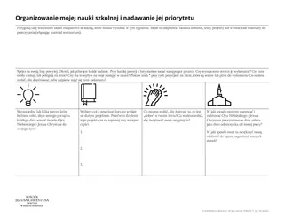 Aby pomóc uczniom w ocenie mocnych i słabych stron swojej organizacji obowiązków szkolnych, możesz umieścić na widoku poniższe instrukcje. Niektórzy z twoich uczniów mogą czuć zniechęcenie, gdy będą dokonywać tej samooceny. Zapewnij ich, że Bóg kocha nas, ponieważ jesteśmy Jego dziećmi, cierpliwie podchodzi do naszego rozwoju i chętnie pomaga nam się ulepszać.