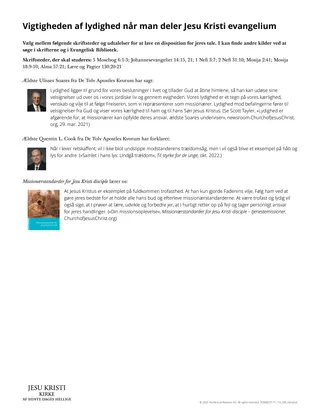 At vælge at være lydige, fordi vi elsker vor himmelske Fader og Jesus Kristus, er en vigtig del af vores jordiske rejse (se Joh 14:15). Vores personlige lydighed er især vigtig, når vi repræsenterer Frelseren Jesus Kristus som medlemmer af hans Kirke og som fuldtidsmissionærer. Denne lektion kan hjælpe eleverne til at indse vigtigheden af lydighed, når man udfører Frelserens værk som missionærer.