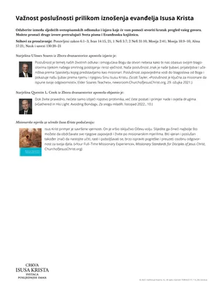 Odabir da budemo poslušni zato što volimo Nebeskog Oca i Isusa Krista ključan je dio našeg smrtnog putovanja (vidi Ivan 14:15). Naša osobna poslušnost posebno je važna kada predstavljamo Spasitelja Isusa Krista kao članovi njegove Crkve i kao cjelodnevni misionari. Ova lekcija može pomoći polaznicima prepoznati važnost poslušnosti u vršenju Spasiteljeva djela kao misionari.