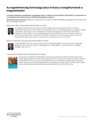 Halandó utazásunk elengedhetetlen részét képezi az a döntés, hogy engedelmesek leszünk, mert szeretjük Mennyei Atyát és Jézus Krisztust (lásd János 14:15). A saját engedelmességünk különösen fontos, amikor a Szabadítót, Jézus Krisztust képviseljük az Ő egyháza tagjaiként és teljes idejű misszionáriusokként. Ez a lecke segíthet a tanulóknak felismerni, milyen fontos az engedelmesség, amikor misszionáriusként a Szabadító munkáját végezzük.