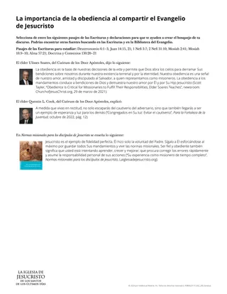 Considere invitar a los alumnos a crear un bosquejo que sirva para un discurso de tres a cinco minutos. Para ayudar a los alumnos a hacerlo, podría entregarles el volante “La importancia de la obediencia al compartir el Evangelio de Jesucristo”.