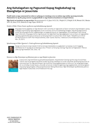 Kung susunod kayo nang buong puso, ipapakita ninyo sa Panginoon ang inyong kahandaang sundin Siya, ang inyong pagmamahal sa Kanya at sa ating Ama sa Langit. Mas lalawak ang inyong espirituwal na pag-unlad. Makikilala ninyo ang Tagapagligtas, at ito ang gagawa ng lahat ng kaibhan sa inyong misyon at sa inyong buhay. (Scott Tayler, “Obedience Is Critical for Missionaries to Fulfill Their Responsibilities, Elder Soares Teaches,”newsroom.ChurchofJesusChrist.org, Mar. 29, 2021)