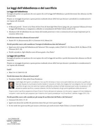 La prossima scheda, intitolata “Le leggi dell’obbedienza e del sacrificio”, ha lo scopo di aiutare gli studenti ad approfondire la comprensione di queste leggi. Ecco alcuni possibili modi in cui gli studenti possono completare la scheda: