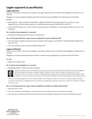 Tatăl Ceresc îi iubește pe toți copiii Săi. Unul dintre modurile prin care Tatăl Ceresc Își arată dragostea este acela de a-i invita pe copiii Săi să facă legăminte cu El în templu. Aceste legăminte includ promisiunea noastră de a ne supune legii supunerii și legii sacrificiului. Această lecție poate ajuta cursanții să înțeleagă legea supunerii și pe cea a sacrificiului pe care, în cadrul înzestrării, facem legământ să le ținem.