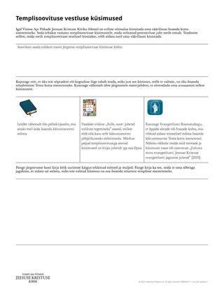 Andke igale õpilasele jaotmaterjal pealkirjaga „Templisoovituse küsimused”. Paluge neil kirjutada leitud küsimus jaotmaterjali ülaosas olevasse kasti. Seejärel võivad õpilased täita ülejäänud osa jaotmaterjalist. Rohkem abi mõningate küsimuste mõistmiseks leiate selle õppetunni osast „Lisamaterjalid” Eevangeeliumi Raamatukogust.