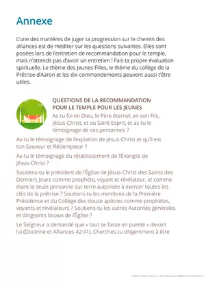 Consultez les questions de l’entretien de recommandation pour le temple qui se trouvent dans l’annexe du livret Jeunes, soyez forts : un guide pour faire les bons choix, 2022, et faites ce qui suit :