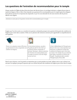Distribuez à chaque apprenant un exemplaire du document intitulé « Les questions de l’entretien pour une recommandation pour le temple ». Demandez-leur d’écrire la question qu’ils ont choisie dans la case qui se trouve en haut du document. Invitez-les ensuite à compléter le reste du document. Vous trouverez une aide supplémentaire pour comprendre certaines de ces questions dans la section « Documentation complémentaire » de cette leçon dans la Médiathèque de l’Évangile.