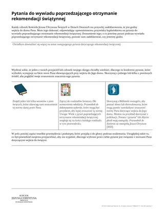 Rozdaj każdemu uczniowi egzemplarz ulotki zatytułowanej „Pytania do rekomendacji świątynnej”. Poproś ich, aby zapisali wybrane pytanie w ramce na górze ulotki. Następnie uczniowie mogą wypełnić pozostałą część ulotki. Dodatkowa pomoc w zrozumieniu niektórych pytań znajduje się w części Dodatkowe zasoby do tej lekcji w Bibliotece ewangelii.