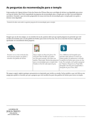 Distribua uma cópia do material intitulado “As perguntas da recomendação para o templo” para cada aluno. Peça-lhes que escrevam a pergunta que identificaram no retângulo no alto da folha. Em seguida, os alunos podem concluir o restante do material. Ajuda adicional para entender algumas das perguntas pode ser encontrada na seção Recursos adicionais desta lição na Biblioteca do Evangelho.