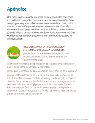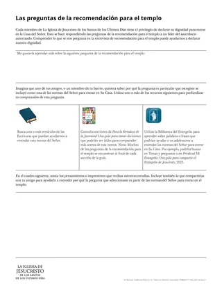 Consulta las preguntas para la recomendación del templo que se encuentran en el apéndice de Para la Fortaleza de la Juventud: Una guía para tomar decisiones, 2022, y haz lo siguiente: