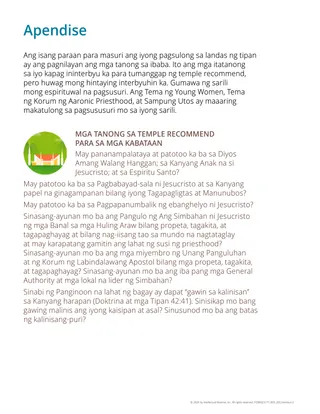 Basahin ang mga tanong para sa temple recommend na matatagpuan sa appendix ng Para sa Lakas ng mga Kabataan: Isang Gabay sa Paggawa ng mga Pagpili [2022] at gawin ang sumusunod: