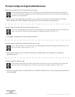 Bed dem om at nedskrive de budskaber, de føler, at Herren sendte dem under generalkonferencen. Tilskynd dem til at komme tilbage til klassen efter generalkonferencen klar til at fortælle, hvad de gjorde for at forberede sig. Hvis det ikke er for personligt, kan de også fortælle, hvilke budskaber de hørte fra Herren.