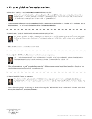 Voisit sen jälkeen kutsua oppilaita etsimään lisää ideoita käyttämällä monistetta ”Näin saat yleiskonferenssista eniten”. Tässä on tapoja, joilla monisteen käyttäminen voi olla tehokasta: