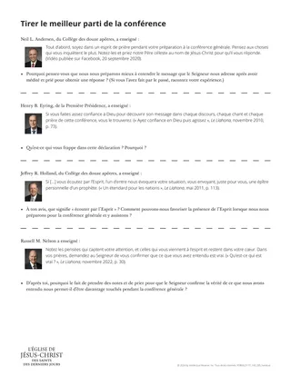 Préparation des apprenants : Demandez aux apprenants de méditer sur les bénédictions qu’ils pourraient recevoir en regardant la prochaine conférence générale et sur la manière de s’y préparer.