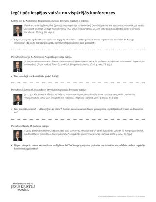Piezīme: Tā kā vispārējā konference notiek divreiz gadā, iespējams, jums šo nodarbību vajadzēs mācīt divas reizes. Lai uzzinātu par citiem veidiem, kā mācīt šo nodarbību, skatiet šīs nodarbības sadaļu „Papilduzdevumi” Evaņģēlija bibliotēkā, vietnē ChurchofJesusChrist.org.