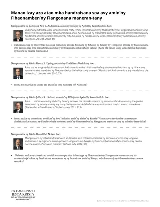 Fanamarihana: Satria atao indroa isan-taona ny fihaonamben’ny Fiangonana maneran-tany dia mety ilainao ny mampianatra ity lesona ity indroa. Mba hahitana fomba hafa hampianarana ity lesona ity dia jereo ny fizarana Sahanasa fianarana fanampiny ato amin’ity lesona ity ao amin’ny Médiathèque de l’Évangile ao amin’nyChurchofJesusChrist.org.