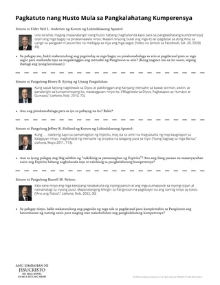 Upang matulungan ang mga estudyante na pagnilayan ang kanilang paghahanda para sa pangkalahatang kumperensya, maaari mong ipakita ang mga sumusunod na tanong sa self-assessment.