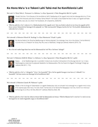 Fakatokangaʻi ange: Koeʻuhí ʻoku hoko tuʻo ua ʻa e konifelenisi lahí he taʻu takitaha, mahalo ʻe fiemaʻu ke ke akoʻi tuʻo ua ʻa e lēsoni ko ʻení. Ki ha ngaahi founga kehe ke akoʻi e lēsoni ko ʻení, vakai ki he konga ʻo e Ngaahi ʻEkitivitī Fakalahi ki he Akó ʻi he lēsoni ko ʻení ʻi he Gospel Library ʻi he ChurchofJesusChrist.org.