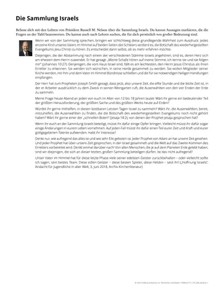Wenn Ihre Schüler keinen Zugang zu einer gedruckten oder digitalen Version der Ansprache haben, können Sie jedem Schüler das Arbeitsblatt „Die Sammlung Israels“ geben. Dieses Arbeitsblatt enthält den Teil der Ansprache, der in dieser Lektion behandelt wird. Sie könnten den Schülern auch vorschlagen, sich diesen Teil der Ansprache in dem Video „Hoffnung Israels“ von Minute 30:26 bis 33:37 anzusehen (auf ChurchofJesusChrist.org verfügbar).