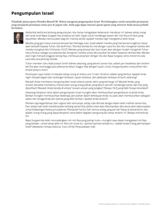 Sepanjang tahun, siswa akan memiliki beberapa kesempatan untuk menelaah pesan-pesan Tuhan yang diberikan oleh para pemimpin-Nya yang diilhami. Dokumen “Templat untuk Mengajarkan Pesan-Pesan dari Para Pemimpin Gereja” adalah alat yang dapat Anda gunakan untuk membantu Anda membimbing siswa Anda sewaktu mereka menelaah pesan-pesan ini. Pelajaran ini memberikan contoh bagaimana Anda dapat menggunakan templat untuk mengajarkan ceramah Presiden Nelson “Yang Jadi Harapan Israel” ([kebaktian remaja sedunia, 3 Juni 2018], Perpustakaan Injil). Pelajaran ini dapat membantu siswa menindaki ajakan Presiden Nelson.