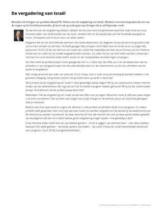 Als uw cursisten geen toegang hebben tot een gedrukte of digitale versie van de toespraak, kunt u de cursisten de hand-out ‘De vergadering van Israël’ geven. Op deze hand-out staat het gedeelte van de toespraak dat in deze les aan bod komt. U kunt de cursisten ook vragen om dit gedeelte van de toespraak vanaf tijdcode 30:26 tot 33:37 te bekijken in de video ‘Hoop van Israël’ op ChurchofJesusChrist.org.
