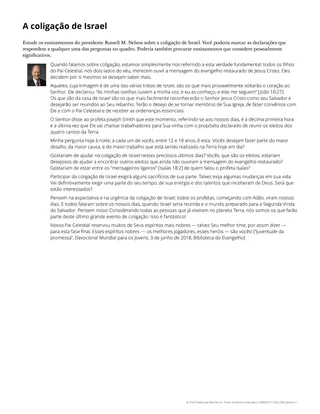 Meus queridos e extraordinários jovens, vocês foram enviados à Terra nesta época específica, a época mais importante da história do mundo, a fim de ajudarem na coligação de Israel! Não há nada acontecendo neste momento na Terra que seja mais importante do que isso. Não há nada que tenha maior consequência. Absolutamente nada. (“Juventude da promessa”, Devocional Mundial para os Jovens, 3 de junho de 2018, Biblioteca do Evangelho)