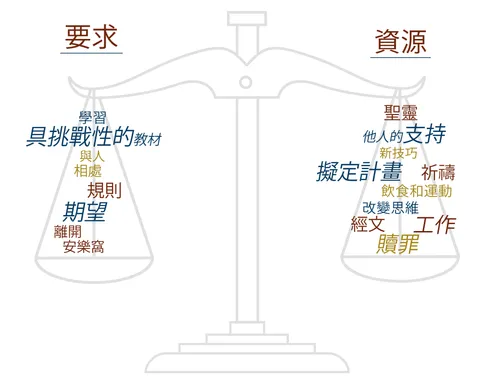 當你有了各種資源,可以用來達到傳道事工的種種要求時,就會有所成長、貢獻,保持在綠色等級。有時候,你可以藉著減少不必要的一些要求來達到這樣的平衡;不必要的要求例如不切實際的自我期望,或者擔憂別人的想法。不過,傳道方面的要求有很多是無法減少的。你需要學習新教材、學習和別人好好相處、服從規定、教導、作見證,離開你的安樂窩。